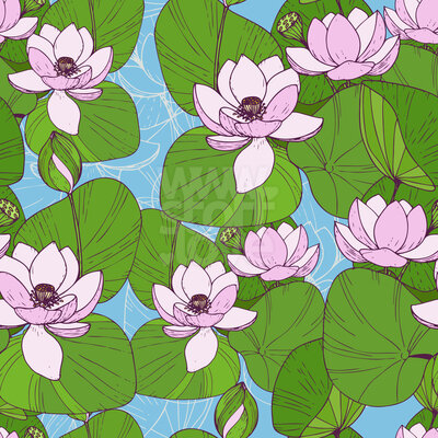 Blooming Water Lily: Seamless floral vector pattern with blooming water lilies.